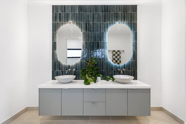 The master suite is complete with a fully fitted walk-in robe offering soft-close drawers, double hanging space, and a dedicated shoe shelf. The luxurious ensuite showcases a 40mm stone benchtop, floor-to-ceiling feature tiles, and twin LED-lit mirrors, adding a touch of elegance. The remaining bedrooms are fitted with built-in robes featuring versatile storage solutions, while the main bathroom is equally impressive with a freestanding bath, an oversized shower, and hidden storage. A dedicated study room with a built-in desk and drawer unit provides the perfect work-from-home space.