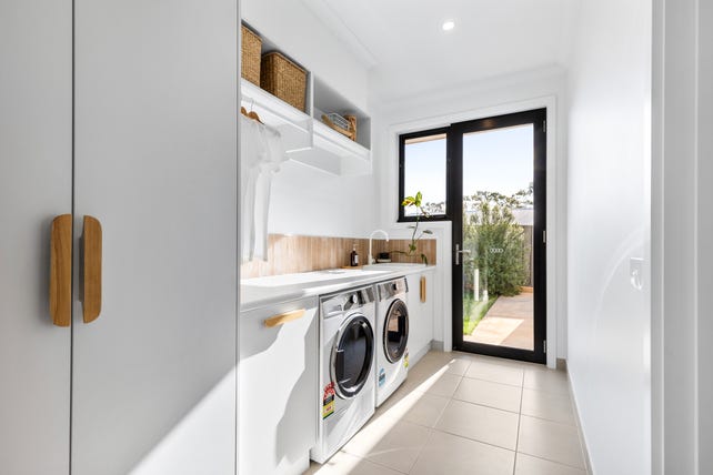 Designed for effortless living, the laundry includes a pull-out hamper drawer, a tall cupboard with power points, and overhead shelving with a drying rail. Storage is abundant throughout the home, ensuring everything has its place. The extended garage and workshop space come with a sectional panel-lift door, motorized operation, and dual remotes, offering convenience and security.