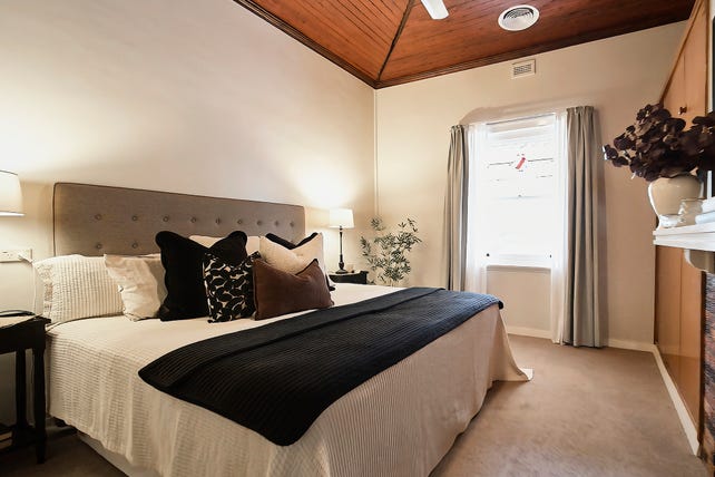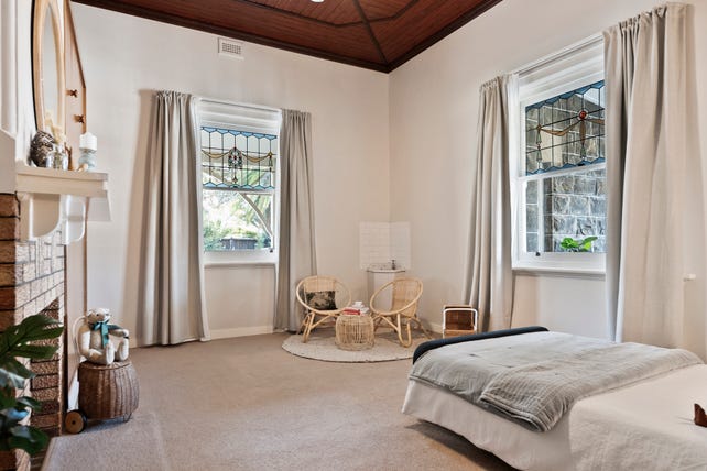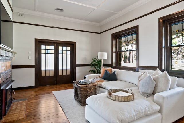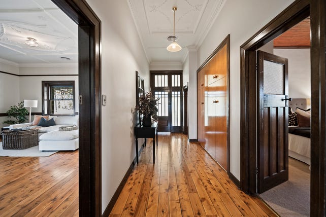 Behind the intriguing facade framed by an iconic verandah with timber arches, the home boasts unique 3.3 m timber-lined ceilings, rich polished timber floors, art deco influenced leadlight-glazed sash windows, plaster ceiling panels, tapestry brick fireplaces and solid doors.