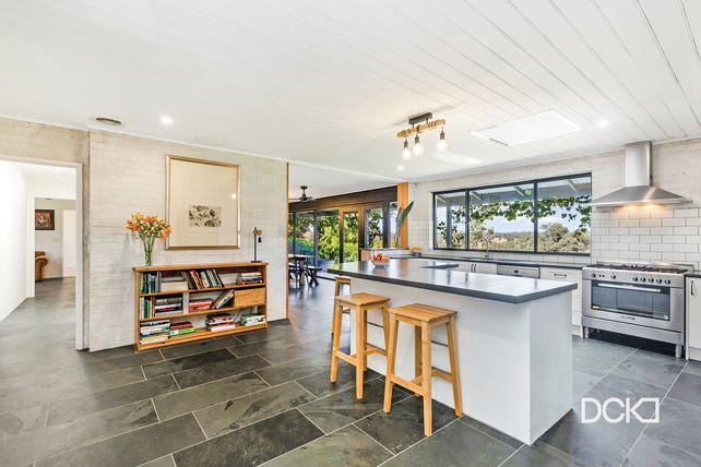 The limewashed exterior, full-length veranda draped in vines, and multiple outdoor entertaining spaces set the tone for relaxed living. Inside, the open-plan design features a stunning kitchen with stainless steel appliances, a vast dining area with panoramic views, and a formal lounge with a stone fireplace.